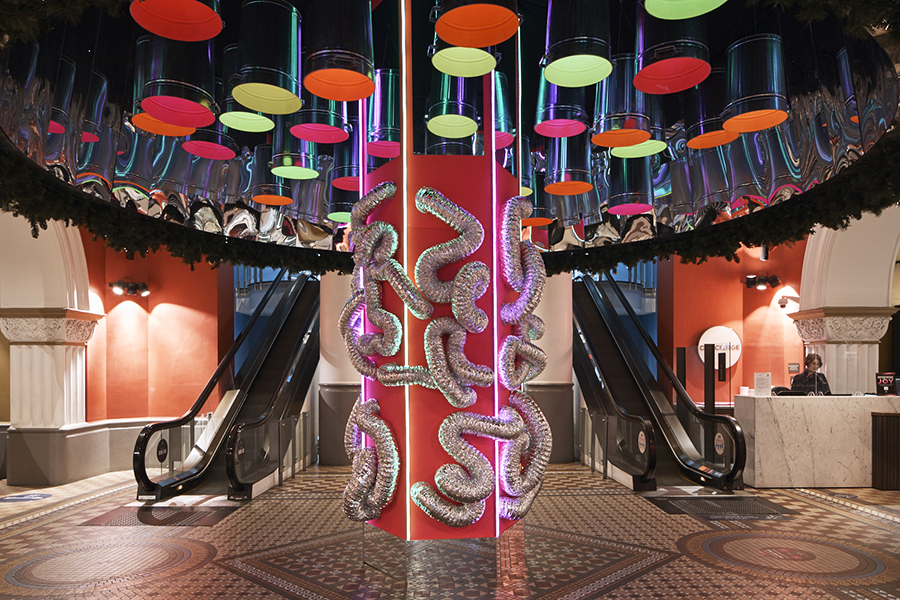 Made especially for this time, ‘The 2020 Tree’ has been adorned with everyday objects such as children’s clamshell sandpits and traffic cones to bring to life how the ordinary has become extraordinary this year. The crowning lightning bolt stands tall on the top of the tree, as a symbolic gesture that sparks joy and reignites the city.