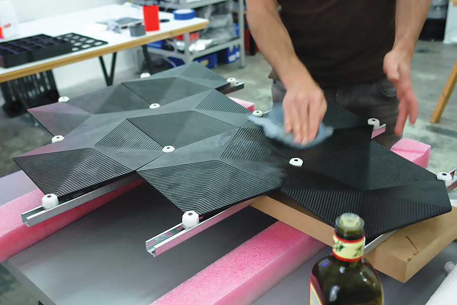 A prime example of this is the German auto company Audi, which has partnered with ‘Made of Air’ to pioneer the HexAudi façade panel system for the exterior of its dealership piloted at Trudering-Riem, an outer suburb of Munich. In simple terms, the façade sucks in carbon from the atmosphere. The product is a combination of Made of Air’s proprietary biochar, the key carbon-negative element, and bio-based polymer binders. The result is granular materials that can be thermoformed using existing processes. In effect, this material is a permanent carbon sink that goes beyond reducing embodied emissions, providing the double benefit of carbon removal and avoided emissions. For the Audi application, ten tonnes of CO2 have been sequestered from the atmosphere.