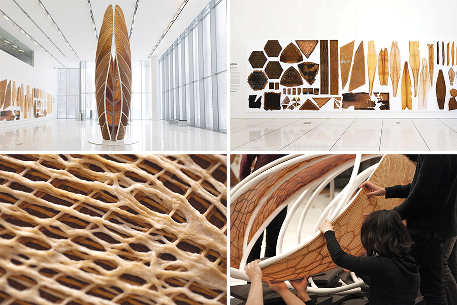 Oxman has pioneered a creative practice that combines design, biology, computing and materials engineering. She defines her work as ‘material ecology’ and seeks to promote the relationship between nature and humanity from consumption on the one hand to preservation on the other to one that embodies complete synergy. Her groundbreaking work entitled Aguahoja – utilising water-based digital fabrication – sees the creation of architected building materials – materials that take on new properties through the interplay of chemistry and geometry – to form organic composites, demonstrating the power of using natural materials to create large-scale 3D printed panels that can be assembled into functional and structural built forms.
