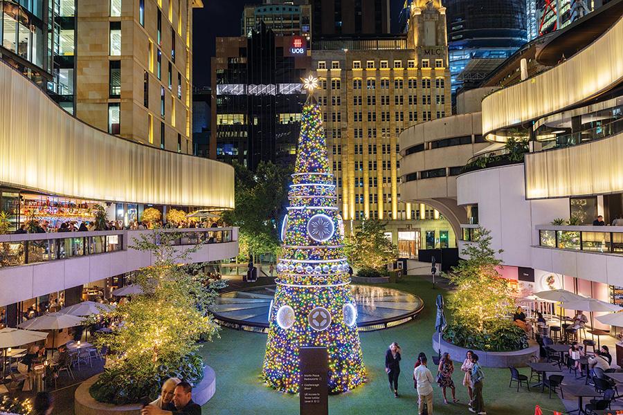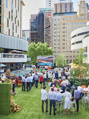After the success of the Melbourne Cup activation at 25 Martin Place, many of the restaurants reported that they were fully booked leading into Christmas. For the festive season, a spectacular 11-metre tall Christmas tree adorned with gold and platinum medallions inspired by the architecture of Harry Seidler’s iconic destination took up residence in the forecourt. The space was further activated through a Perrier-Jouët pop-up Champagne bar and a nightly line-up of live music. However, it was the astroturf and communal furniture that was one of the greatest hits, with customers enjoying the atmosphere and beautiful weather from early in the day into the evening.