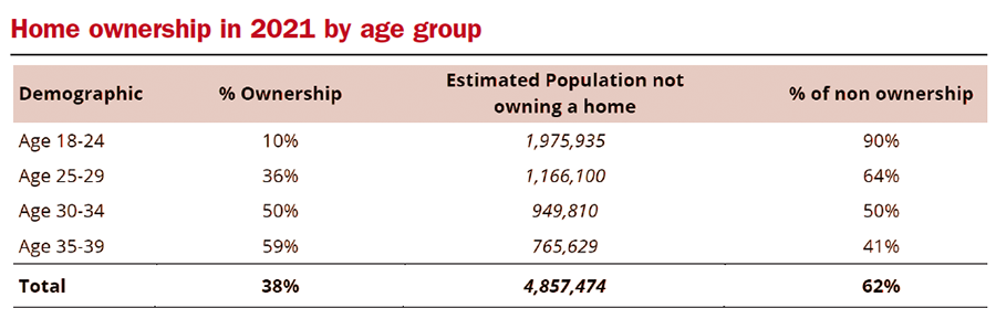 Further analysis of this demographic shows that 62% of Australians under the age of 39 currently do not own a home. This represents 4.85 million people, or 19% of the total Australian population, which is a population group equivalent to all of ‘Gen X’ (age 40 to 54) in the country.