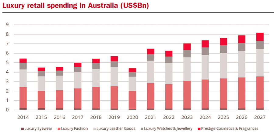 The luxury retail market in Australia is worth approximately US$6.7bn annually, with this market expected to growth annually by +5.42% (CAGR 2022-2027), according to Statista. The largest sector for luxury retail in Australia is the luxury fashion market, representing $2.6bn annually and is forecast to grow to as much as $3.39bn by 2027.