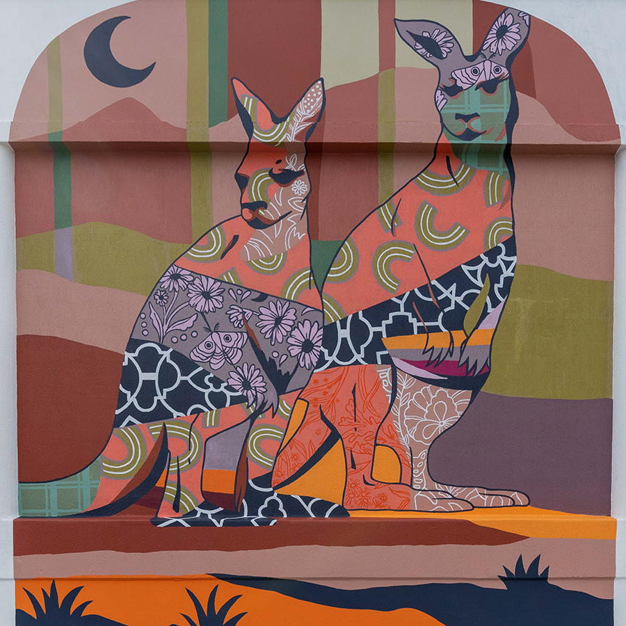 The main mural, which is about 65 metres long and seven metres high, features some of Australia’s most cherished mammals and birdlife – kangaroos, a kookaburra and a budgerigar – as well as marine life and flowers united by abstract motifs. A playful mural along the internal wall of the Terrace features cheeky parrots dining.