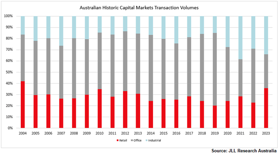 Andrew Quillfeldt, Head of JLL Capital Markets Research Australia said: “Retail transaction volumes were only down by 8% YoY compared with -41% across all sectors, reflecting the slew of deals occurring in late-2023. While the outlook for rates has been volatile, global capital markets are now reflecting lower official cash rates for many of the major established markets, which is helping to improve conviction in underwriting future funding costs for real estate investors, and that the current round of monetary policy tightening from central banks may have concluded.”