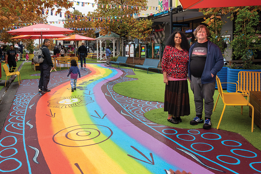 At Stockland Point Cook, we collaborated with longstanding community partner CoLocal and artists Fiona Clarke and Kenneth McKean to create a 50-metre-long road mural, The Point Cook Rainbow Serpent.