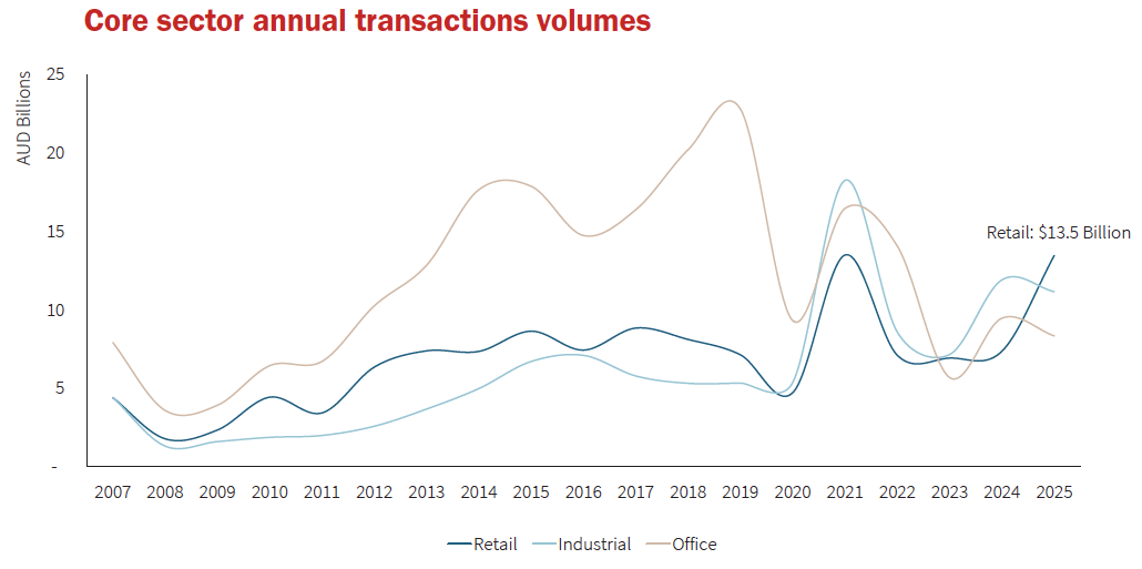 Total retail property transaction volumes reached $13.5 billion in 2025, representing a 56 per cent increase on 2024 volumes and sitting 87 per cent above the 10-year average, driven predominantly by shifting global sentiment and a gradual reweighting towards the sector by capital sources. For the first time on record, retail emerged as the highest-traded real-estate sector nationally, outtrading both the office and industrial sectors. This underscores the sector’s resilience and signals a fundamental shift in capital allocation strategies.