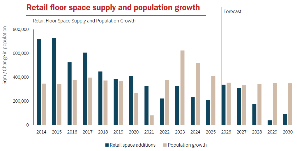 The floor space supply-side constraints further amplify this investment case. The feasibility of building new retail assets of scale remains at an historical low, with new regional centre development representing less than 5 per cent of all new retail space from 2020-25, compared with 15 per cent from 2010-15. This dramatic decline in new supply creation has intensified competition for existing assets, particularly those with dominant market positions and strong tenant covenants. With population growth set to outpace retail space additions, Australia requires an estimated 38 Big Gun-scale centres by 2030, in a mid-case scenario, to maintain current floor space requirements on a per capita basis; however, the pipeline for this scale of asset remains close to empty.