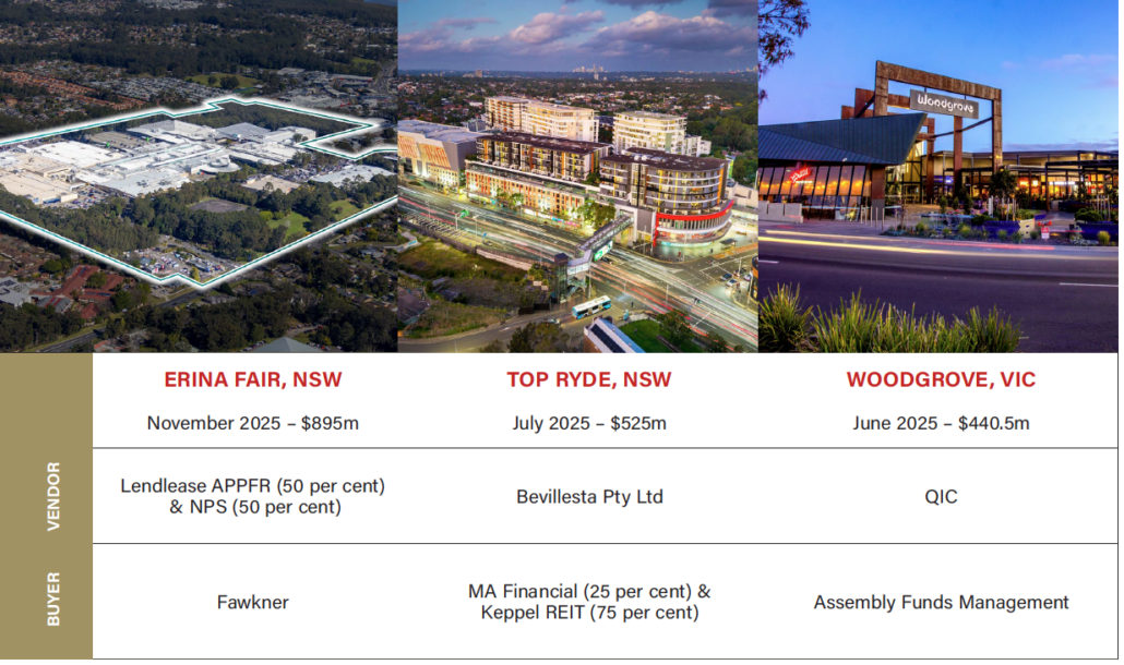 The year was anchored by several landmark transactions that exemplified the sector’s transformation. Erina Fair’s $895 million sale to Fawkner Property Group at a 6.25 per cent market yield became the year’s standout transaction as Australia’s largest single asset sale in history by dollar value, while Top Ryde City attracted attention through its $525 million acquisition by Keppel REIT (75 per cent) and MA Financial (25 per cent), marking the Singaporean REIT’s debut Australian retail investment. Woodgrove Shopping Centre’s $440.5 million sale to Assembly Funds Management further reinforced pricing resilience across the sector.