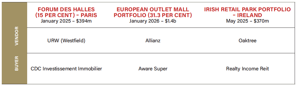 The success of the retail sector is not just a domestic story. Globally, retail transaction volumes are 15 per cent above the prior five-year average as sales of Big Gun-size assets have been more prominent across major global economies. European activity has been particularly noteworthy, with URW making its first major acquisition since 2019, providing a vote of confidence in the market. Australian superannuation funds have also begun looking internationally, with Aware Super taking a 31.3 per cent stake in a European outlet mall platform, driven by tight Australian supply, global diversification and growth ambitions.