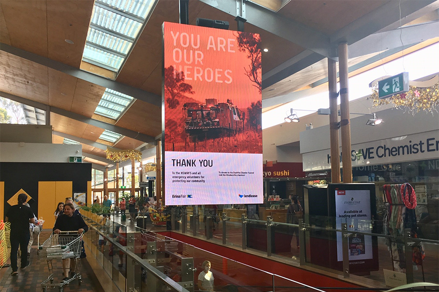 Lendlease managed shopping centres across Australia are actively supporting the bushfires response by utilising their digital screen network and the thousands of customers who walk through their centres each week. The campaign will be featured on fourteen screens across nine Lendlease shopping centres around Australia until the end of November.