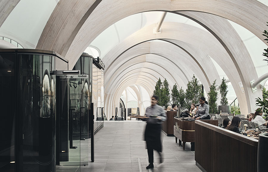 Inspired by the arched glass roof that is iconic to Chadstone, The Link is formed from a curved ‘glulam’ timber structure with a tensile, semi-translucent ‘PTFE’ fabric stretched over to protect customers, guests and visitors from the weather, yet still connect people to the environment.