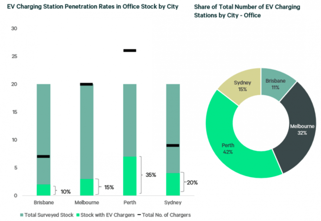 At an office level, the stocktake shows that Perth has the highest charging station penetration rate, with 35% of the city’s surveyed buildings having charging stations and Perth accounting for 43% of the charging stations across all four cities.