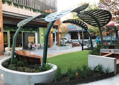 Along with new retail tenancies, this vision is achieved with new hard and soft landscaping, locally commissioned indigenous artwork and interactive lighting. The development reveals a relaxed and approachable feeling and also exhibits a bit of humour and colour. This design sensibility is particularly at play in the car park entries and connections from the car park into the Bradley street precinct where local artists including Byrd, Dai Cameron and Goodie have painted street art at the stair and walkway connections.