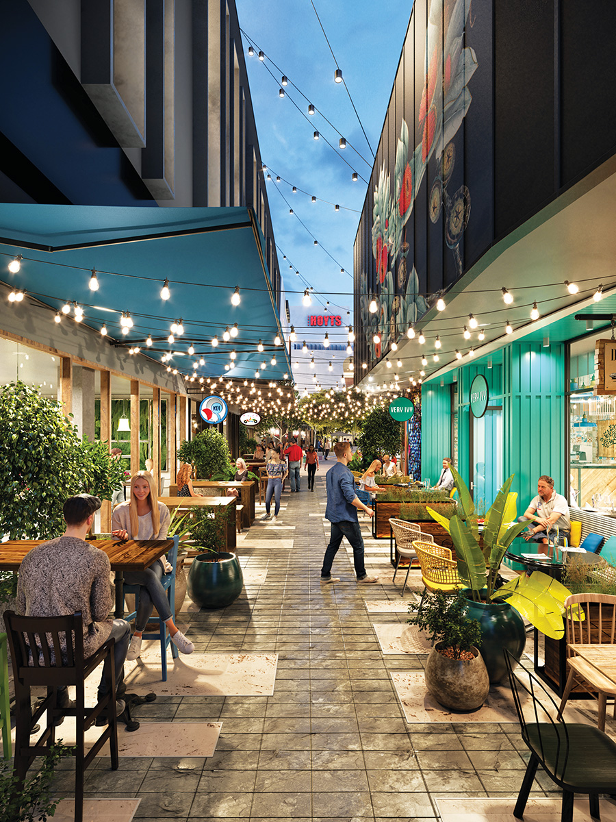 West Deck – Dining & Entertainment Precinct (Laneway) looking towards new Hoyts cinema