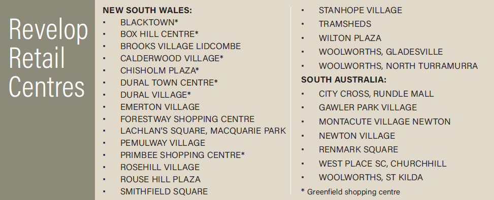 Revelop now owns (all properties including retail) a GLA of some 500,000m2, has more than 1,800 tenants spread across 80 odd properties with a development pipeline in excess of $1 billion! Of that holding, retail has become the largest sector. Revelop today owns some 26 shopping centres (see box below) and to gain an insight into the sheer dynamism of this company, one just has to see Revelop’s announcements and achievements of the past 12 months.