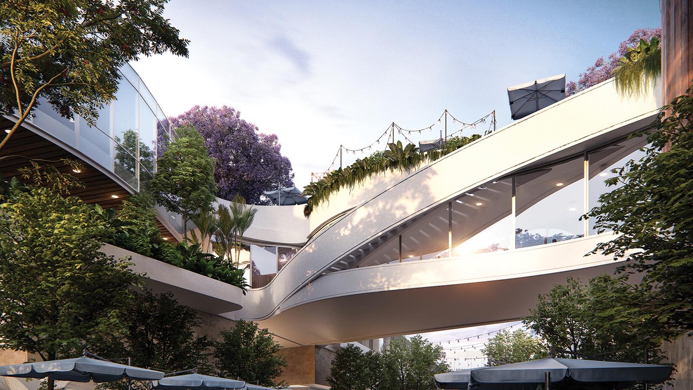 It’s a ‘racetrack’ configuration and its incorporation with the existing centre is outstanding. They are creating a voided opening leading to the level above; it’s a feature stairway with escalator access as well. But the void takes us visually to a third level, on one side of Oswald Street anchored by the upper level of David Jones and on the other, a massive 14-screen Event Cinema complex.