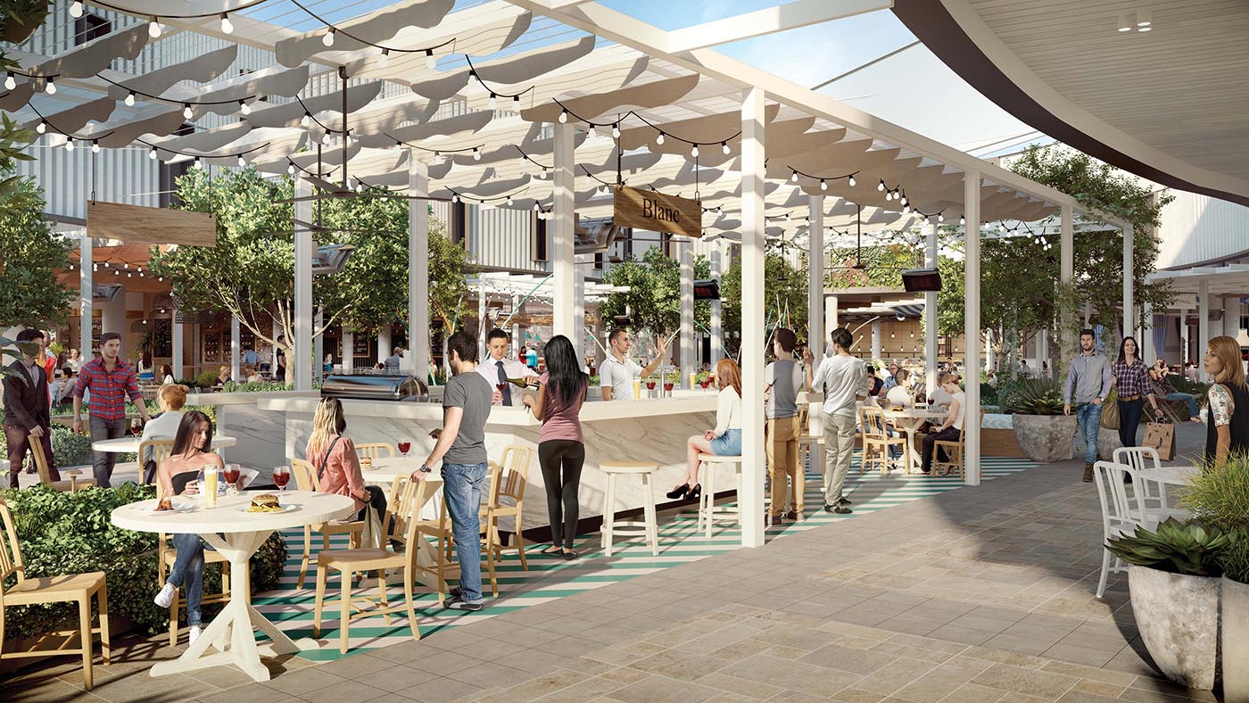 Today, one enters the site from Ellen Stirling Boulevard via Oswald Street, which runs between Westfield Innaloo and the Mega Centre. It’s a non-descript street, part of Scentre Group’s land holding, but it’s destined to become an iconic landmark retail strip at the centre of the new Westfield Stirling. At ground level it’s a busy, active, totally transformed street with alfresco pockets flanked by vibrant retail. The Mega Centre will be totally redeveloped internally and a new retail plan will totally re-mix it.