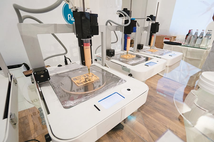 If you are worried, rest assured – everything on the menu at Food Ink is edible, despite being made by a machine and not a human. In a process that looks similar to piping icing out of pastry bags, ingredients are pureed, packed into 3D moulds, and then ‘printed’ with a Dutch-made 3D printing machine called ByFlow. The moulds are guided with the robotic ‘arm’ of the printer to create dishes at a level of precision rarely achieved by a human chef. Together, they’re creating foods like olive caviar served on a Petri dish, smashed peas, pizza dough and chocolate mousse, all printed live in front of an audience.