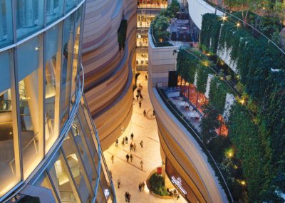 The Jerde Partnership Architects from the US have long been a pioneer in this space, creating iconic experiences since the 1980s. The benchmark Fashion Island underwent expansion and renovation in 1988, based on John Jerde’s design which included elements of water, landscape and courtyards with interactive fountains. In 2003, Jerde conceived Namba Parks in Osaka Japan as a large park, as a natural intervention in the city’s dense urban centre. Alongside a 30-storey tower, the project features a lifestyle centre crowned with a rooftop park that crosses multiple blocks while gradually ascending eight levels. The sloping park connects to the street, welcoming passersby to enjoy its grove of trees, clusters of rocks, cliffs, lawns, waterfalls, ponds and outdoor terraces.