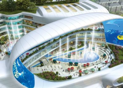 Los Angeles-based architects AmphibianArc have designed a shopping centre Dongfeng in Zheng Zhou, based on a traditional Chinese treasure bowl which symbolises fortune and peace. The mall features incredible indoor and outdoor landscapes with an elevated fountain plaza, and an indoor canal to a huge aquarium located in the centre. Its 350,000m2 of retail, entertainment and restaurants is spread over nine floors and is topped with a hotel and roof garden.