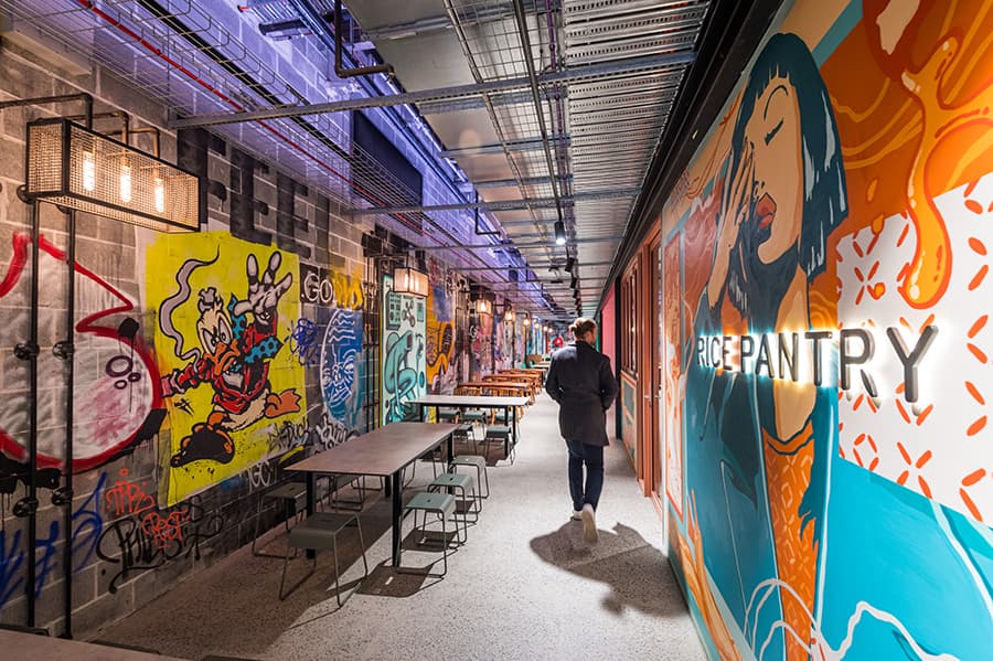 Designed by Hames Sharley, leading architects across retail, town centre and urban development, the former industrial façade has been up cycled in consultation with the Inner West Council, to honour the heritage of the local area. Large-scale murals by local artists decorate the external walls and, by nightfall, the building glows with neon lights. We’ve created a sensory journey that starts in the early morning and can take you right through until late evening.