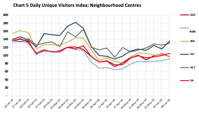 The important role played by the neighbourhood centre, especially in Victoria, over the lockdown period and the evidence of panic shopping around mid-March primarily via neighbourhood centres, show up in the above trends. The steady recovery for all centre types across all states is also becoming evident, including for regional centres in Victoria which are quickly closing the gap on regionals in other states.