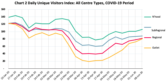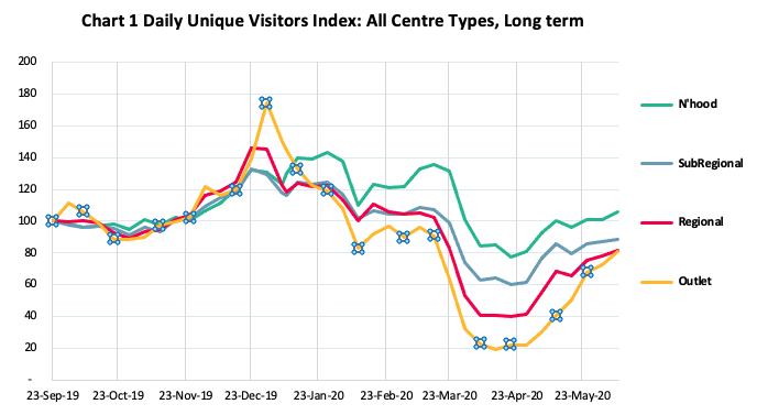 The early recovery in visitation levels continues to gain momentum steadily across all centre types though with Neighbourhood centres maintaining their status as the centre format least affected.