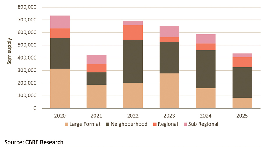 The bulk of this new space will be comprised of neighbourhood and large format retail centres off the back of population growth and resilient demand. Once the current development cycle is complete, interest rate hikes may help to slow consumption levels and new construction starts.