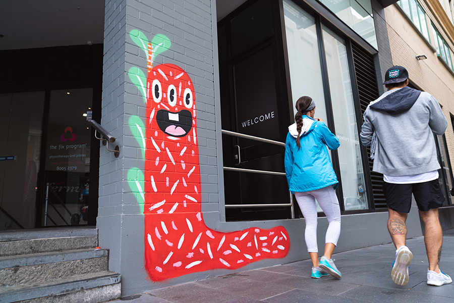 Over at neighbouring Broadway Sydney yarn bombing artist Alison Thompson has enveloped objects in the laneways and entries to the precinct with her playful art, while mural artist Ginger Taylor has delighted patrons with her bold imagery emblazoned in surprising spots around Bay and Francis streets. The popup art continues Broadway’s ongoing engagement with playful public art in interesting locations.
