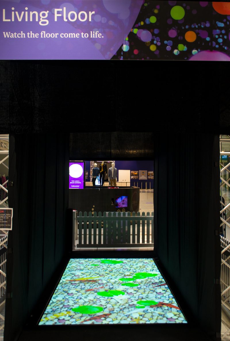 A high-definition projection of a koi pond with swimming fish and rippling water that interacts with customers and engages their senses as they walk.