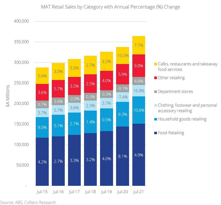 These sustained lockdowns have forced retailers to innovate and adapt their retail strategies with new; online, click-and-collect, and buy-now/pay-later capabilities, crucial for retailers in prevailing through interrupted trade periods as consumers were forced away from normal shopping environments. It is evident from the July 2021 ABS figures, that captured Australia’s activities out of lockdown, that retail trade remains highly desirable to consumers, especially when met with retailers that continue to evolve to meet demand.