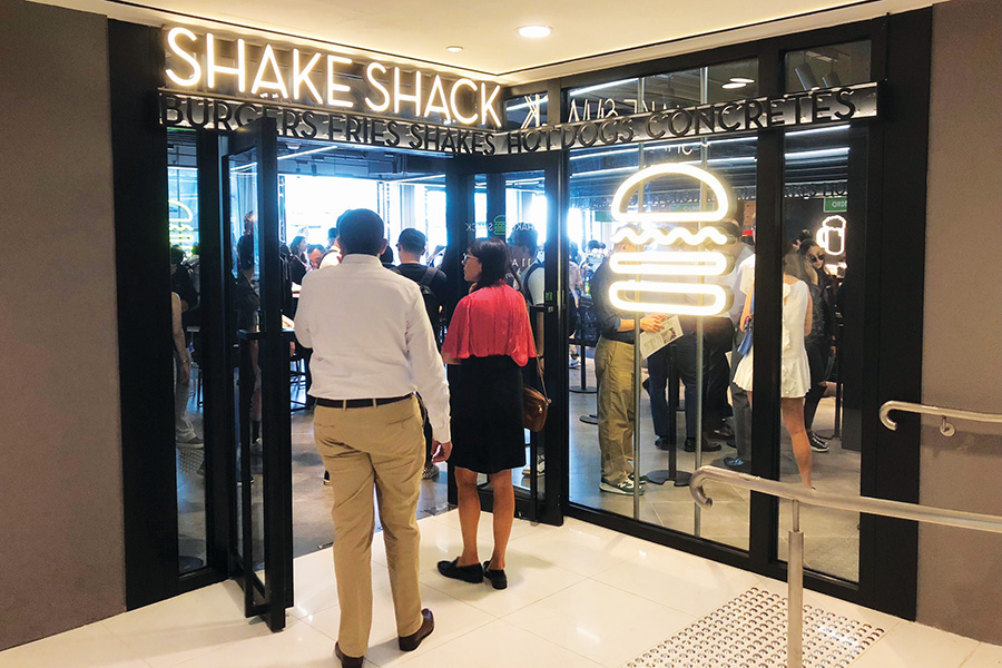 “The food items list is cantilevered over the entry space in the form of an I-beam sculpture – or, more specifically, the ‘menu as the building,” says Wines. “The perforated zinc façade material is intended to reflect the colour and rib-like surfaces of the Flatiron Building.” These elements have been carried over to all the Shacks. A significant level of design finesse and thought has gone into the design of the built environment and branding of Shake Shack and the rewards are evident, with queues lining out both entries at the IFC Mall location.