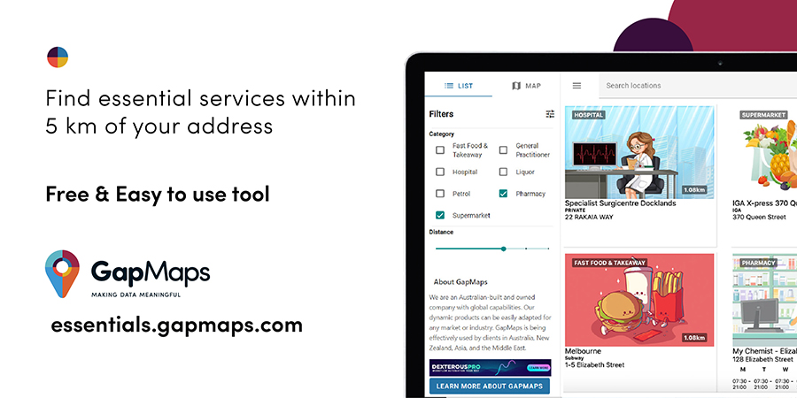 Anthony Villanti, MD & Founder of GapMaps, said, “We are offering this platform as a free service to support the Victorian community. All Victorians can use the platform to quickly and easily identify the addresses of all essential services which are located within a 5 km radius of their home or work. We have also provided access to the Victorian Government Department of Health Services for their online support.”