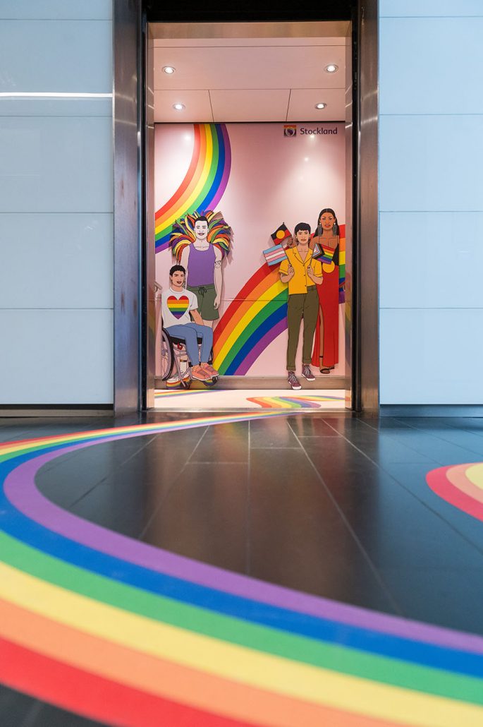 Stockland Piccadilly customers can see the campaign with rainbow decals on the centre’s staircases and pillars, as well as life-size installations of the illustrations on the upper ground floor, food court, and lifts.